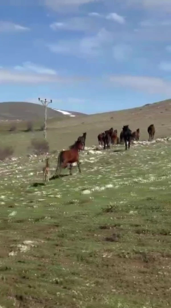 Amasya’da Akdağ’ın maskotu yılkı atları seyir halindeki araçların önüne çıktı. Amatör kameraya yansıyan sürüdeki taylar da ilk defa görüntülendi.