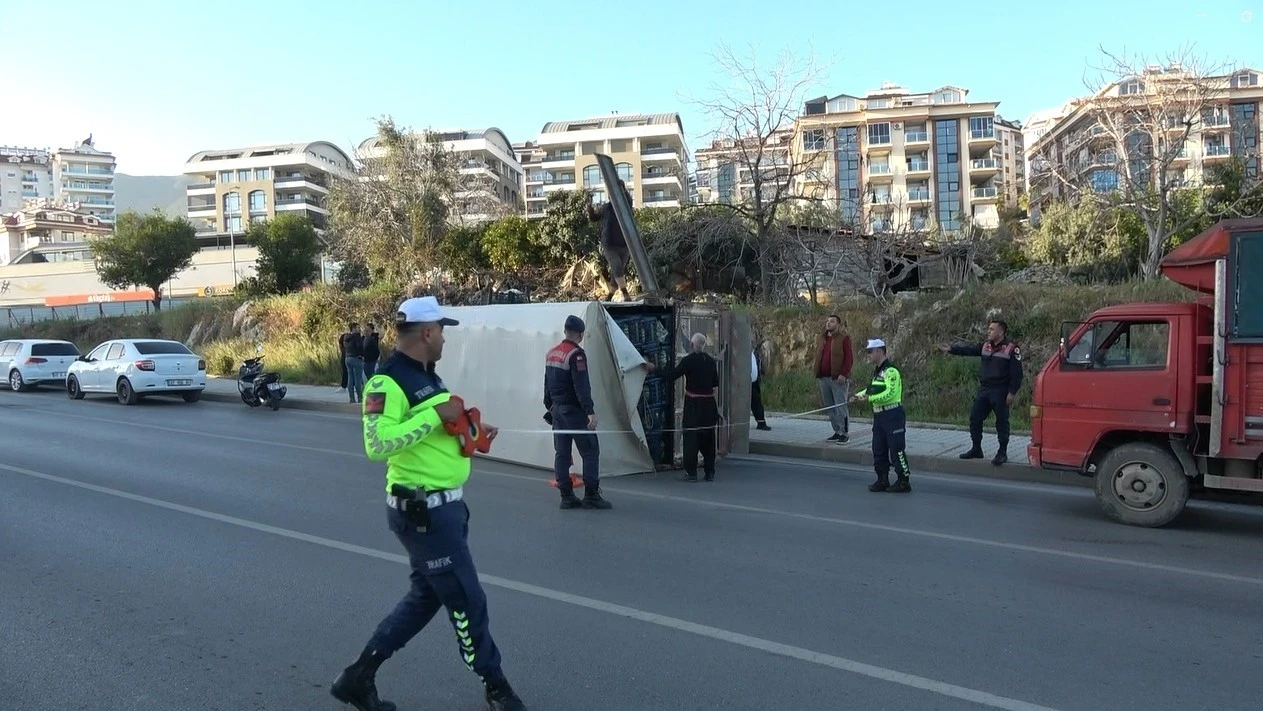 Antalya’nın alanya ilçesinde direksiyon hakimiyetini kaybeden muz yüklü kamyonet önce yol kenarındaki bordur taşına çarpıktan sonra devrildi.