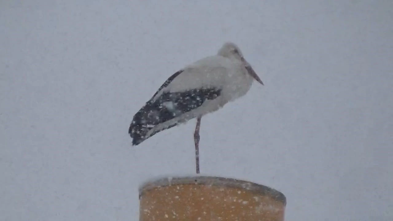 İlkbaharın müjdecisi olarak bilinen leylekler, havaların ısınmasıyla birlikte göç yollarına düştü. Tunceli’nin Pülümür ilçesine gelen bir leylek, bastıran yoğun kar yağışına yakalandı.