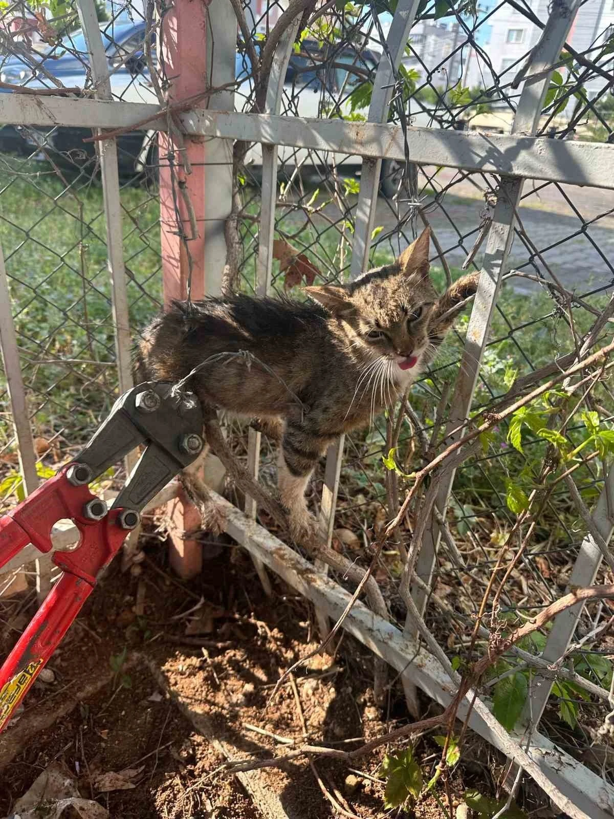 Tarsus ilçesi Akşemsettin Mahallesi’nde bulunan Pakize Bayraktar Okulu’nun bahçesini çevreleyen demir çitlerin arasına bir kedi sıkıştı. Kediyi fark edenler, durumu ekiplere bildirdi. Bölgeye Mersin Büyükşehir Belediyesi itfaiye ekipleri sevk edildi. Ekipler, kediyi bulunduğu yerden çıkartarak Tarsus Belediyesi barınak görevlilerine teslim etti. Kedi barınağa götürülerek bakıma alındı.