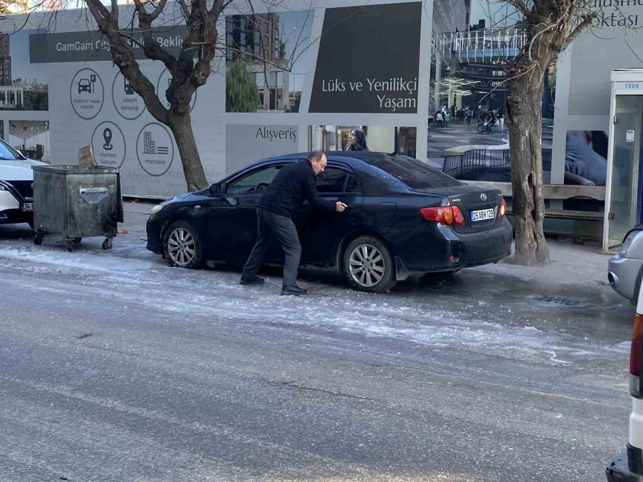 Yurt genelinde olduğu gibi Eskişehir’de de hava sıcaklıkları düşük seviyelerde seyrediyor. Sıcaklığın eksi derecelere kadar düşmesi nedeniyle don olayları meydana gelirken, geçtiğimiz sabah bir sürücü zeminin buzlanması ve kayganlaşması sonucunda otomobilini park ettiği yerden çıkartamadı. Aracı buzun üzerinde mahsur kalan sürücünün yardımına çevreden geçen bir vatandaş koştu. Sürücünün çeşitli manevralar yapması ve vatandaşın arkadan ittirmesi ile araç güçlükle hareket ettirildi.