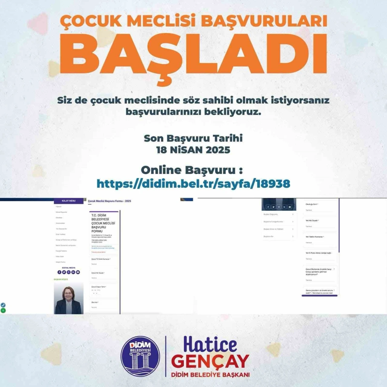 Çocukların temsil yeteneklerinin gelişmesi hedefiyle Didim Belediyesi tarafından hayata geçirilen Çocuk Meclisi için başvurular başlarken, ilk kez kurulacak olan meclis ile Didim Belediyesi örnek bir projeye imza attı. Didim Belediyesi, geleceğin bilinçli bireylerini yetiştirmeye yönelik örnek bir projeye imza attı. Proje kapsamında çocukların yerel yönetime katılımını sağlamak, fikir üretme, karar alma ve sorumluluk bilinci kazanmalarına katkı sağlamak amacıyla Didim’de ilk ’Çocuk Meclisi’ kurulacak. Çocukların da Didim için söz sahibi olabilemesi için ilk kez kurulacak olan meclisin başvuruları da başladı. Didim Belediyesi internet sitesi üzerinden yapılacak olan online başvurular, 18 Nisan 2025 Cuma gününe kadar devam edecek. Çocuk Meclisi’ne 11-14 yaş arası ilk ve ortaokul öğrencileri başvurabilecek. "Hayalleri ile aramızda olmalarını çok istiyoruz"