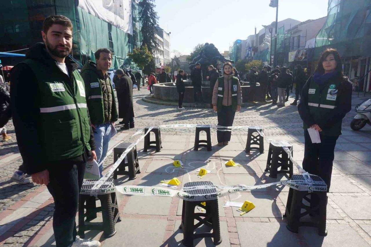 Edirne’de 9 Şubat Sigarayı Bırakma Günü etkinlikleri çerçevesinde Yeşilay tarafından sigaranın ölümcül izlerine dikkat çekmek amacıyla temsili olay yeri sahnesi oluşturuldu.