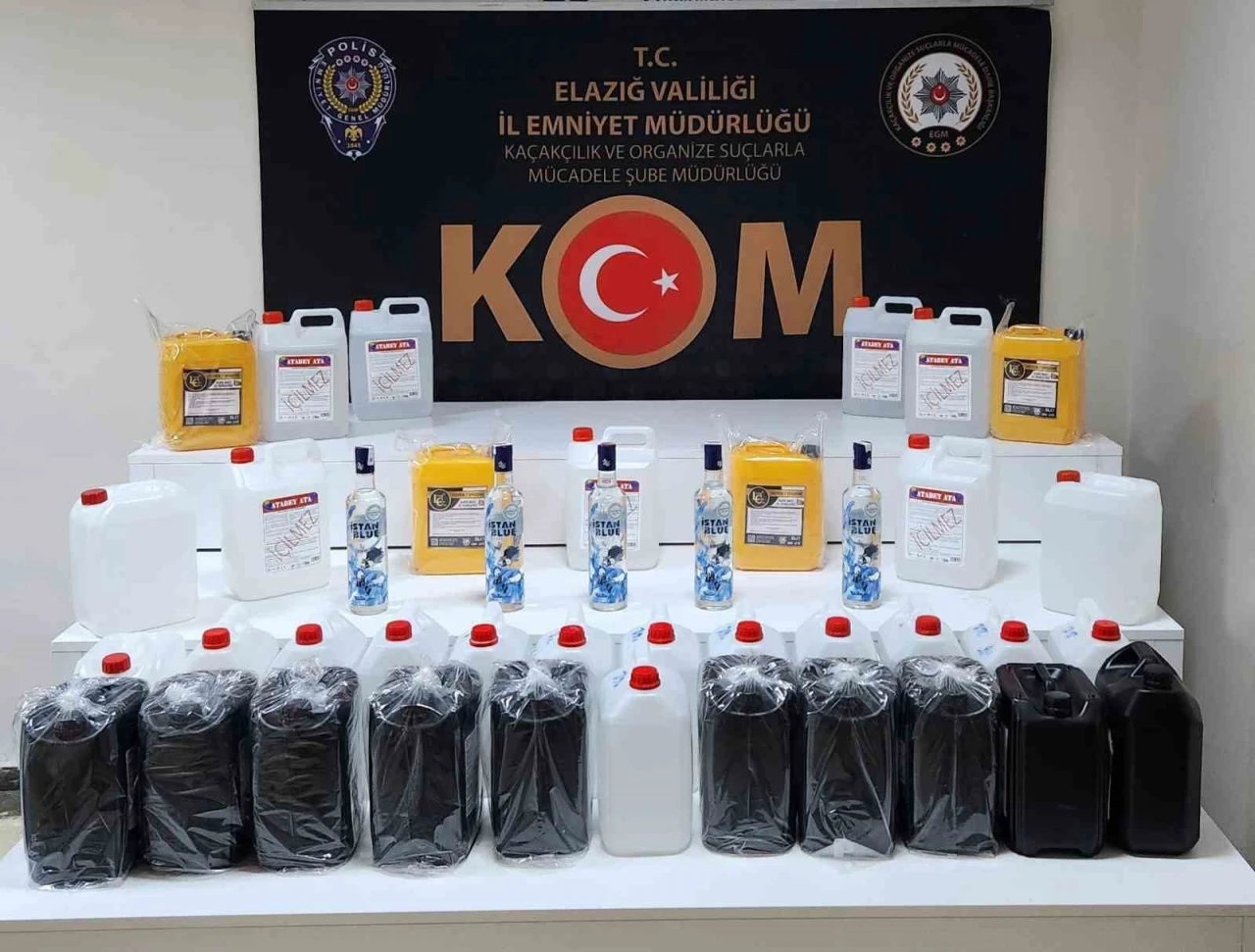 Elazığ Cumhuriyet Başsavcılığı koordinesinde, İl Emniyet Müdürlüğü Kaçakçılık ve Organize Suçlarla Mücadele Şube Müdürlüğü tarafından sahte alkollü içki ticareti yapan, toplum sağlığını tehlikeye düşüren ve haksız kazanç elde eden şahıslara yönelik çalışma yapıldı. Yapılan çalışmalarda sahte alkol üretiminde kullanılan 190 litre etil alkol ve 2 adet alkol kiti ele geçirildi. Çalışmalarda 11 şüpheli şahıs hakkında adli işlem yapıldığı bildirildi.