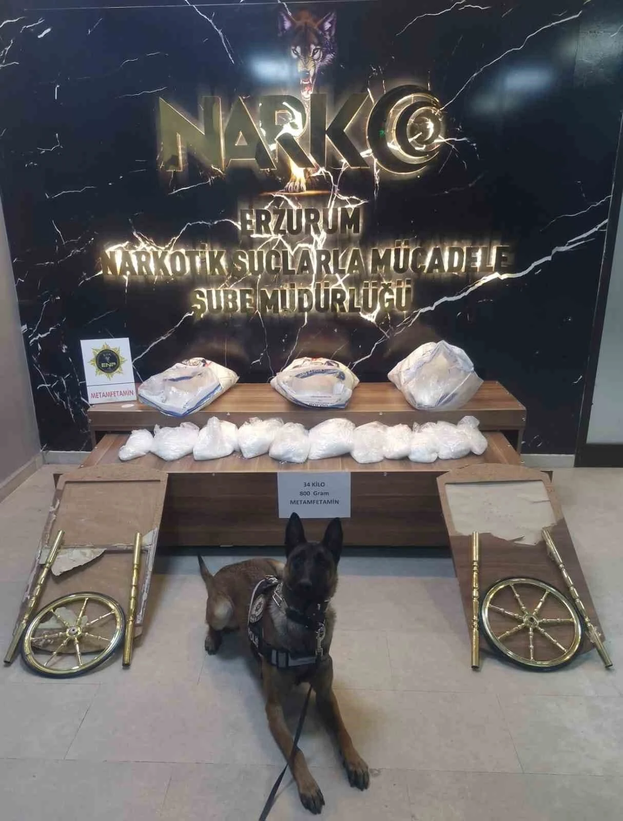 Erzurum Emniyet Müdürlüğü Narkotik Suçlarla Mücadele Şube Müdürlüğü görevlilerince il genelinde uyuşturucu madde konularına yönelik Narkotik Madde Arama Köpeği HERA ile yapılan kontroller neticesinde; 34 kilo 800 gram metamfetamin maddesi ele geçirildi. Konu ile ilgili adli mercilere sevk edilen 4 şahıstan 3’ü tutuklanarak Ceza İnfaz Kurumuna teslim edilirken 1 şahıs hakkında adli sürecin devam ettiği belirtildi.