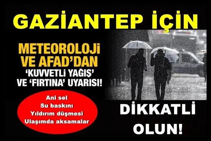 Meteorolojiden yapılan açıklamada, “Yapılan son değerlendirmelere göre; bu gece saatlerinden sonra Adana, Mersin, Osmaniye, Hatay, Gaziantep, yarın (Pazar) sabah saatlerinden itibaren Kahramanmaras çevrelerinde kuvvetli (21-50 kg/m2), Adana'nin dogu ilçelerinde ( Tufanbeyli, Saimbeyli, Feke, Kozan, Imamoglu) ile Hatay kiyilarinda (Erzin, Dörtyol, Payas, Iskenderun, Arsuz, Samandag, Yayladag) yer yer çok kuvvetli (51-75 kg/m2) sağanak ve gökgürültülü sağanak yağış beklendiğinden; sel, su baskını, ulaşımda aksamalar, yıldırım, yerel dolu yağışı ve yapış anında kuvvetli rüzgar gibi olumsuzluklara karşı dikkatli ve tedbirli olunmasi gerekmektedir.”denildi.