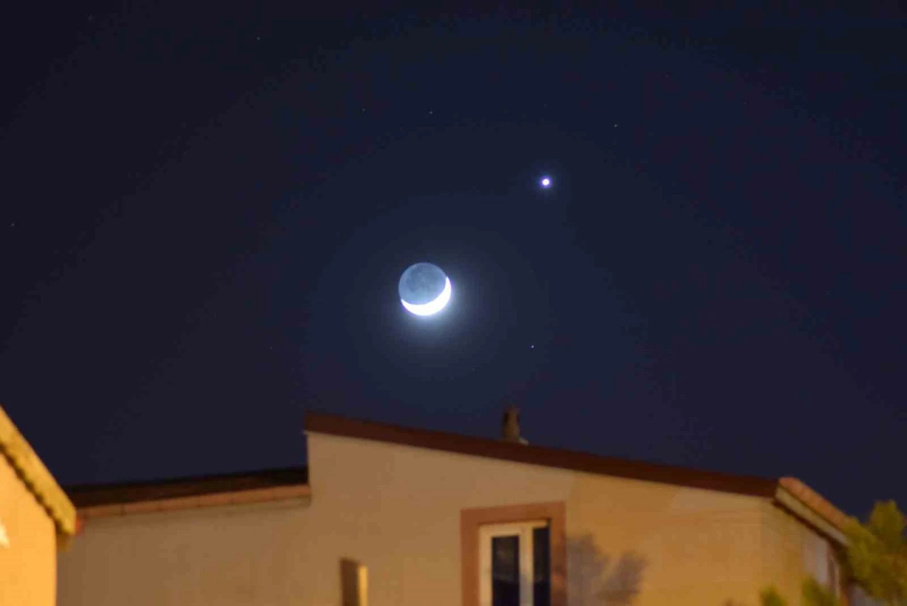 Karaman’da gökyüzünde buluşan hilal şeklindeki ay ile yıldız görsel şölen sundu.