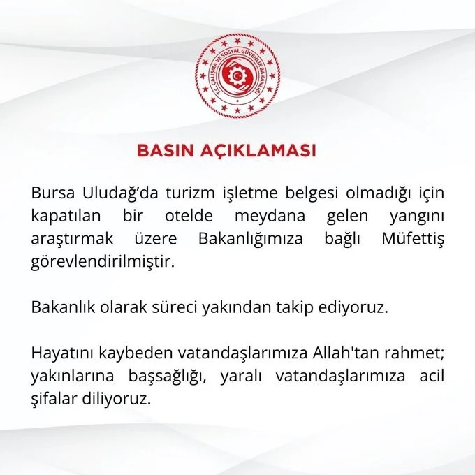 Çalışma ve Sosyal Güvenlik Bakanlığı tarafından Bursa Uludağ’da turizm işletme belgesi olmadığı için kapatılan bir otelde çıkan yangınla ilgili müfettiş görevlendirildi. Bakanlıktan konuyla ilgili yapılan açıklamada, "Bursa Uludağ’da turizm işletme belgesi olmadığı için kapatılan bir otelde meydana gelen yangını araştırmak üzere Bakanlığımıza bağlı müfettiş görevlendirilmiştir. Bakanlık olarak süreci yakından takip ediyoruz. Hayatını kaybeden vatandaşlarımıza Allah’tan rahmet, yakınlarına başsağlığı, yaralı vatandaşlarımıza acil şifalar diliyoruz" denildi.