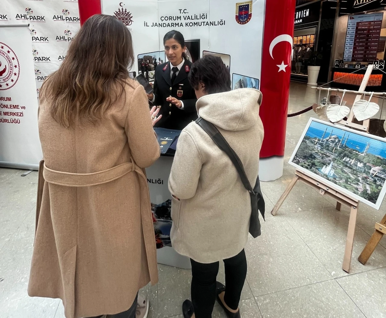 Çorum’da 8 Mart Dünya Kadınlar Günü’nde jandarma ekipleri tarafından kadına yönelik şiddetle mücadeleyle mücadeleyle ilgili vatandaşlara bilgilendirmede bulunuldu.