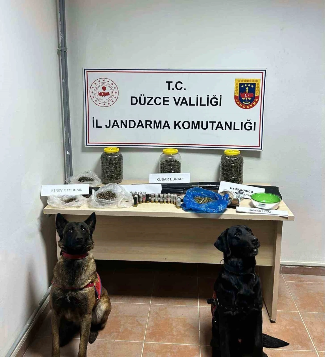 Düzce’de Cumhuriyet Başsavcılığı koordinesinde jandarma ekiplerinin uyuşturucu ile mücadelesi devam ediyor. Gümüşova ilçesi Pazarcık köyünde İlçe Jandarma Komutanlığı ve KOM Şube Müdürlüğü tarafından yapılan araştırma sonucunda bir şahsın uyuşturucu ve uyarıcı madde ticareti yaptığına dair alınan duyumlar çerçevesinde şüpheli şahsın ikametlerinde arama yapıldı. Yapılan aramada 3 kavanoz ve ayrı ayrı poşetler içerisinde toplam bin 335 gram kubar esrar maddesi, 1 adet ruhsatsız tek kırma tüfek, 2 adet ruhsatsız otomatik tüfek, çalışır vaziyette hassas terazi, 6 gram kenevir tohumu, uyuşturucu madde kullanma aparatı ve 16 adet av tüfeğine ait kartuş ele geçirildi. Olayla ilgili uyuşturucu madde ticareti yapma suçundan işlem yapılan 1 şüphelinin gözaltına alındığı bildirildi.