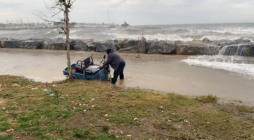 İstanbul genelinde etkisini sürdüren lodos Kadıköy Kalamış’ta dev dalgalar oluşturdu. Metrelerce boya ulaşan dalgalar kıyıya vurarak sahil kısmında su birikintileri oluşturdu. Yaya yolunu kullanmak isteyen vatandaşlar ise zorluk yaşadı. Bir motosikletli de yaya yolunda suya batarak mahsur kaldı. Kadıköy Belediyesi ekiplerinin çalışmaları sonucunda motosiklet battığı yerden çıkarıldı.