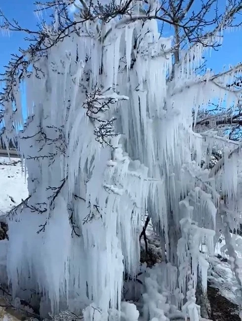 Soğuk hava, ilçede hayatı adeta durma noktasına getirdi. Ağaçların gövde ve dal kısımları neredeyse tamamen buzla kaplanırken, kartpostallık görüntüler meydana geldi.