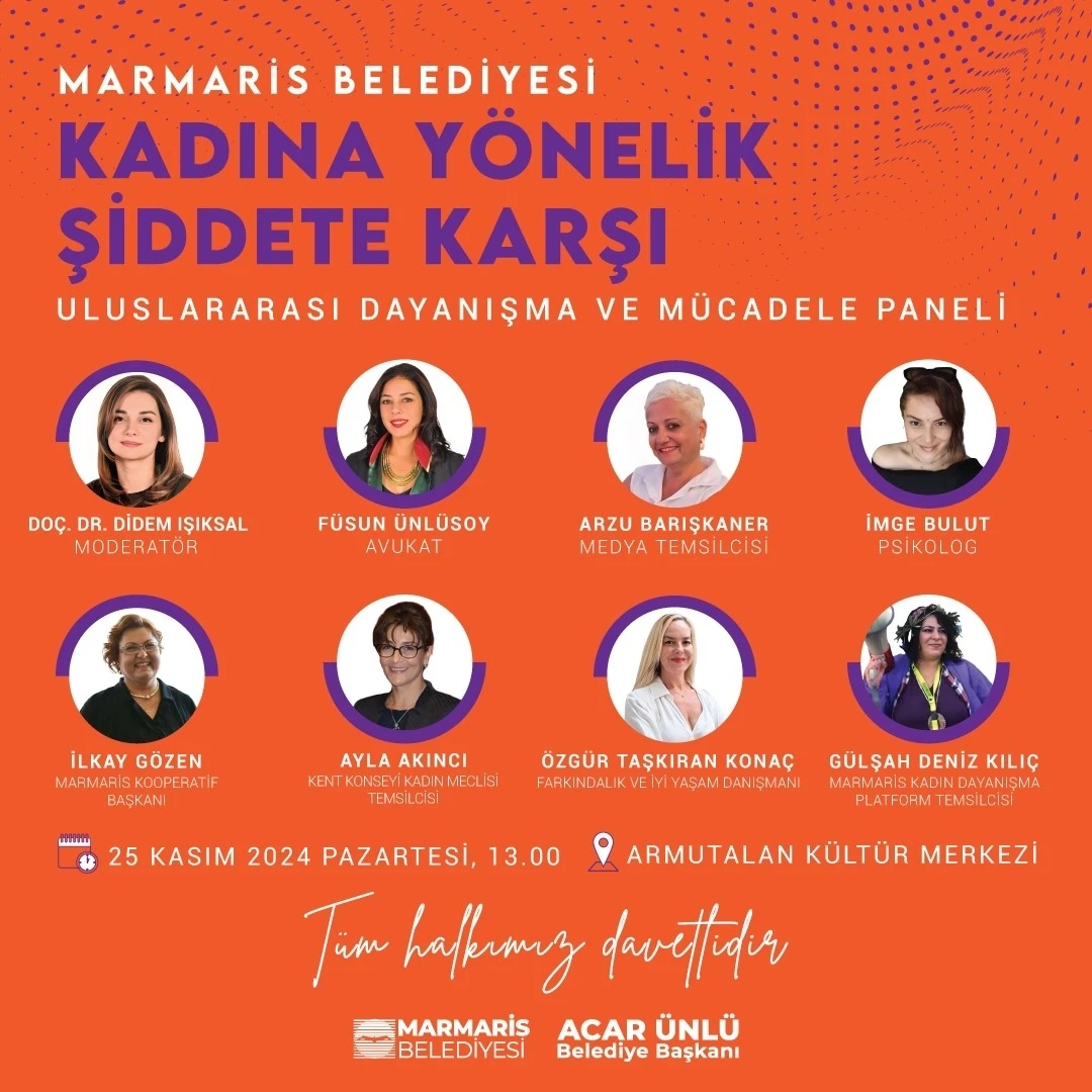 Kadına Yönelik Şiddete Karşı Uluslararası Mücadele Günü dolayısıyla Marmaris’te ‘şiddet’ konulu bir panel düzenlenecek. Marmaris Belediyesi, 25 Kasım Kadına Yönelik Şiddete Karşı Uluslararası Mücadele Günü dolayısıyla bir panel düzenleyecek. Marmaris Belediyesi ev sahipliğinde düzenlenen panelde kadın, aile ve toplum ilişkileri konuşulacak. Doç. Dr. Didem Işıksal’ın moderatörlüğündeki panele Avukat Füsun Ünlüsoy, gazete imtiyaz sahibi Arzu Barışkaner, Marmaris Belediyesi psikoloğu İmge Bulut, Marmaris Kadın Kooperatifi Başkanı İlkay Gözen, Kent Konseyi Kadın Meclisi Temsilcisi Ayla Akıncı, Farkındalık ve İyi Yaşam Danışmanı Özgür Taşkıran Konaç, Marmaris Kadın Dayanışma Platform Temsilcisi Gülşah Deniz Kılıç konuşmacı olarak katılacak. Şiddetin her türüne karşı çözüm önerilerini güçlendirmek adına yapılacak panel 25 Kasım Pazartesi günü saat 13.00’te Armutalan Kültür Merkezi’nde yapılacak.