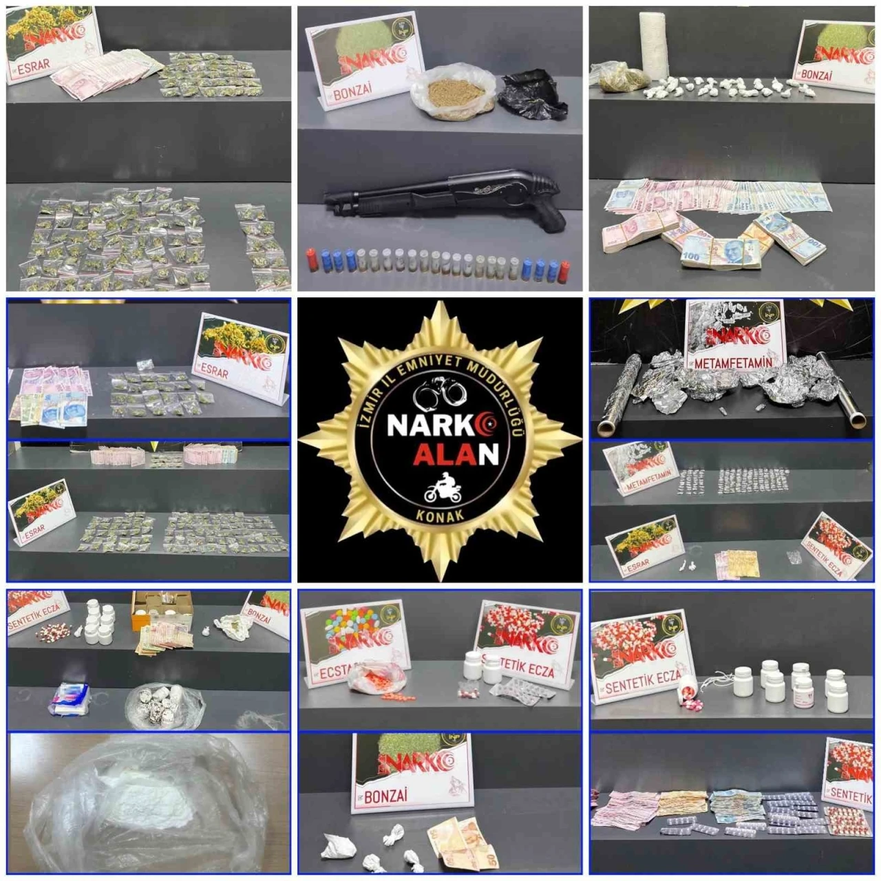 İzmir’de uyuşturucu ticaretinin önlenmesine yönelik özel oluşturulan ’Narkoalan’ ekipleri tarafından zehir tacirlerine yönelik Şubat ayı boyunca çok sayıda operasyon gerçekleştirildi. Operasyonlarda, yüklü miktarda satışa hazır uyuşturucu madde ele geçirilirken, olaylarla ilgili gözaltına alınan 19 şüpheliden 11’i tutuklandı. Konak İlçe Emniyet ve Narkotik Suçlarla Mücadele Şube Müdürlüğü personellerinden oluşturulan ’Narkoalan’ ekipleri, uyuşturucu madde ticareti yapan şüphelilerin korkulu rüyası oldu. Şubat ayı boyunca, Narkoalan ekipleri tarafından gerçekleştirilen uygulama ve denetimlerde, yüklü miktarda bonzai, esrar, kokain, metamfetamin, ekstazi ve sentetik hap ile uyuşturucu madde ticaretinden elde edildiği değerlendirilen 201 bin 930 TL nakit para ele geçirildi. Olaylarla ilgili 19 şüpheli gözaltına alınırken, emniyetteki işlemlerinin ardından adliyeye sevk edilen 11 şüpheli, çıkarıldığı mahkemece tutuklandı.