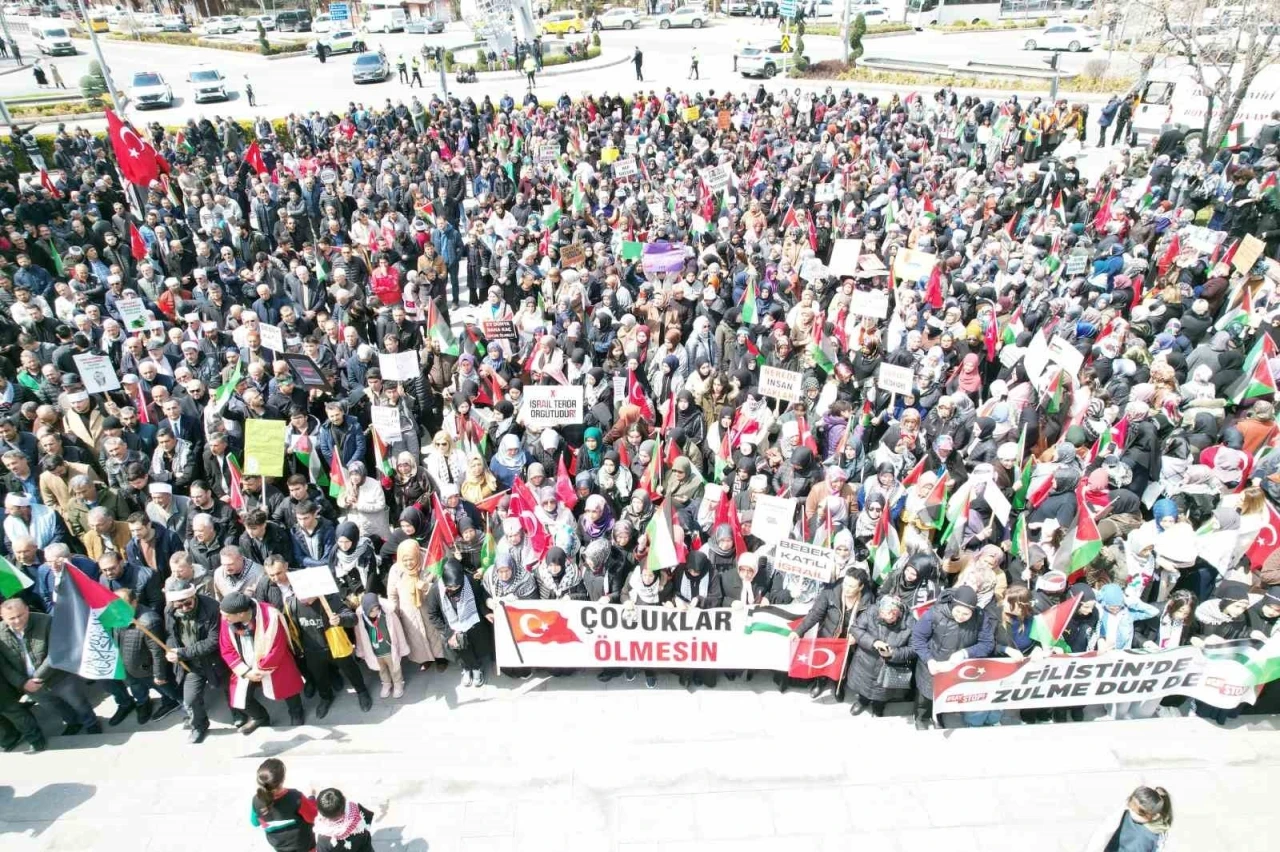 İsrail’in 7 Ekim 2023’ten bu yana Filistin’in Gazze Şeridi’ne yönelik gerçekleştirdiği, binlerce kişinin hayatını kaybettiği saldırılara dikkati çekmek için düzenlenen yürüyüş için yüzlerce kişi katıldı. Nevşehir Borsa Kavşağından başlayan yürüyüşe siyasi parti temsilcileri, sivil toplum kuruluşları, akademisyenler, sendika ve derneklerin yanı sıra yüzlerce öğrenci ve vatandaş katıldı. Yürüyüş boyunca tekbirler getirilirken ’Çocuklar ölmesin, Her yer Filistin her yer Gazze, Filistin elbet özgür olacak, Çocuklar uyurken susulur ölürken değil zulme dur de, Kahrolsun İsrail enkazını göreyim, Hakkı yenen her halkın yanında İsrail terörünün karşısındayız, Özgür Filistin için ayağa kalk, Acının ırki olmaz’ gibi sloganlar atıldı. Hükümet Konağı önünde Kuran-ı Kerim okunmasıyla başlayan programda grup adına konuşma yapan Harun Öcal; "Gazze’de masum çocukların bombalar altında can verdiği, Kudüs’te Mescidi-i Aksa’nın kutsal dokusunun çiğnendiği, Batı Şeria’da ailelerin evlerinden zorla sürüldüğü bu karanlık tablo, insanlık vicdanını kanatıyor. İsrail, Hamas ile sağlanan ateşkes ve esir takası anlaşmasının 42 günlük birinci aşamasından sonra, 2 Mart’tan itibaren Gazze Şeridi’ne insani yardımların girişini durdurdu ve yine ne acıdır ki vahşetine başladı" dedi. İsrail ordusunun saldırıları yeniden başlatmasından itibaren çoğunluğu yaşlı, kadın ve çocuk olmak üzere bin 163 Filistinlinin hayatını kaybettiğini, 2 bin 735 kişinin de yaralandığını söyleyen Öcal, "Sivil altyapıyı ve hastaneleri de hedef alan katil İsrail, Gazze’de insani bir felakete neden olmaktadır. Bölgeye su ve elektrik tedarikinin kesilmesi ve sınır kapılarının kapalı tutulması Gazze’deki Filistinlilerin yaşadığı zor şartları daha da derinleştiriyor. Kudüs, Ümmetin ilk kıblesi, Siyonist çizmeler altında ezilirken, Müslümanlar nasıl rahat uyuyabilir? Haksızlık karşısında susan dilsiz şeytandır" sözü, bugün İslam âleminin kulaklarında çınlamalı. Siyonist işgal rejimi, çağdaş emperyalistlerin de desteğiyle Gazze’de korkunç katliamlar gerçekleştiriyor" ifadelerini kullandı.