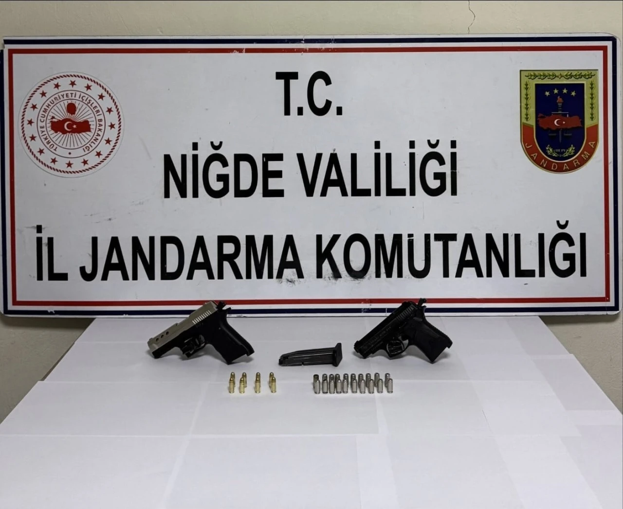 Bor ilçesine bağlı Kemerhisar beldesinde bir şüphelinin evinde yapılan aramada 2 adet ruhsatsız tabanca, 3 adet tabanca şarjörü ve 28 adet tabanca fişeği ele geçirildi. Ulukışla ilçesinde İlçe Jandarma Komutanlığı ve İlçe Emniyet Müdürlüğü ekipleri tarafından ortak yapılan operasyonda da 2 şüphelinin ev ve eklentilerinde yapılan aramalarda ise uyuşturucu madde, 1 adet hassas terazi, 2 adet uyuşturucu kullanma aparatı, 1 adet ruhsatsız kuru sıkıdan bozma tabanca ve 85 adet mermi, 1 adet komando bıçağı,1 adet süngü, 2 adet ruhsatsız av tüfeği ve 200 adet 9 mm çapında tabanca fişeği ele geçirildi.