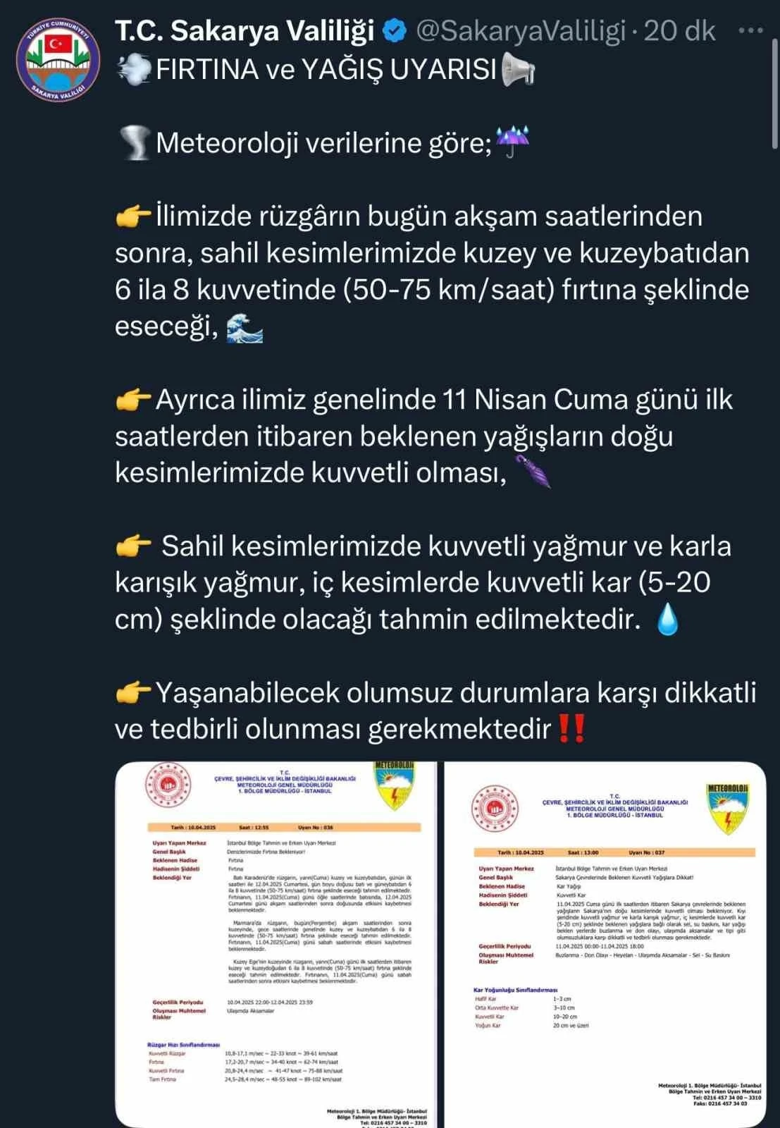 Sakarya Valiliği, meteorolojik verilere göre şehrin sahil kesimlerinde etkili olması beklenen fırtına ile yağışa karşı uyarılarda bulundu. Valilik tarafından yapılan paylaşımda, "Meteoroloji verilerine göre; ilimizde rüzgarın bugün akşam saatlerinden sonra, sahil kesimlerimizde kuzey ve kuzeybatıdan 6 ila 8 kuvvetinde (50-75 km/saat) fırtına şeklinde eseceği, ayrıca ilimiz genelinde 11 Nisan Cuma günü ilk saatlerden itibaren beklenen yağışların doğu kesimlerimizde kuvvetli olması, sahil kesimlerimizde kuvvetli yağmur ve karla karışık yağmur, iç kesimlerde kuvvetli kar (5-20 cm) şeklinde olacağı tahmin edilmektedir. Yaşanabilecek olumsuz durumlara karşı dikkatli ve tedbirli olunması gerekmektedir" ifadelerine yer verildi.