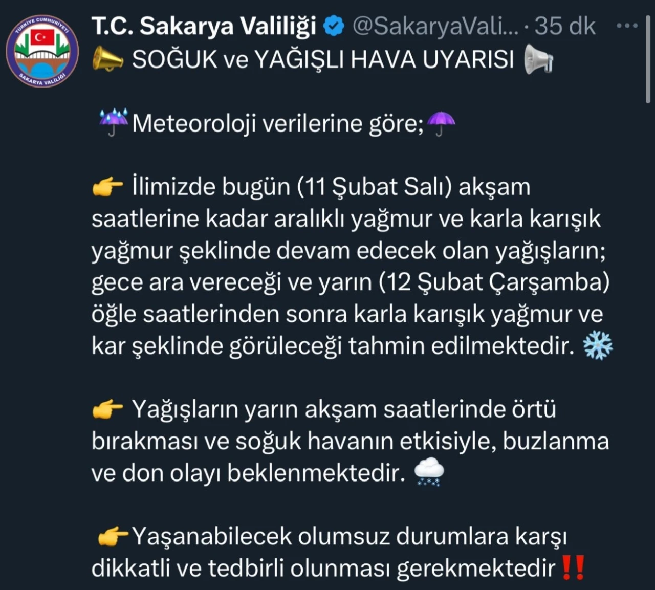 Sakarya Valiliği, meteorolojik verilere göre il genelinde akşam saatlerine kadar aralıklı yağmur ve karla karışık yağmur şeklinde yağışların olacağını, gece yarısı ve Çarşamba günü ise öğle saatlerinden itibaren karla karışık yağmur ve kar yağışına karşı vatandaşlara sosyal medya hesabı üzerinden uyarıda bulundu. Valilik tarafından yapılan paylaşımda, "Meteoroloji verilerine göre; İlimizde bugün (11 Şubat Salı) akşam saatlerine kadar aralıklı yağmur ve karla karışık yağmur şeklinde devam edecek olan yağışların; gece ara vereceği ve yarın (12 Şubat (Çarşamba) öğle saatlerinden sonra karla karışık yağmur ve kar şeklinde görüleceği tahmin edilmektedir. Yağışların yarın akşam saatlerinde örtü bırakması ve soğuk havanın etkisiyle, buzlanma ve don olayı beklenmektedir. Yaşanabilecek olumsuz durumlara karşı dikkatli ve tedbirli olunması gerekmektedir" denildi.