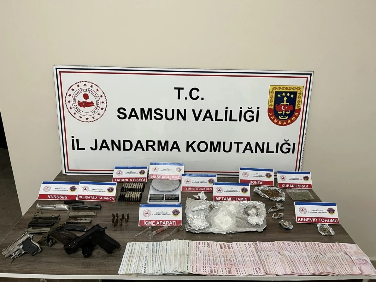 Edinilen bilgiye göre, Terme ilçesinde Y.Ş., F.Ş., R.Ö. ve C.Ç. (40) isimli şahısların uyuşturucu madde ticareti yaptıkları bilgisine ulaşan İl Jandarma Komutanlığı İstihbarat Şube Müdürlüğü, Terme İlçe Jandarma Komutanlığı ve Jandarma Suç Araştırma Timi (JASAT) ekipleri harekete geçti. Şahısların evlerinde yapılan aramada 100 gram metamfetamin, 120 gram bonzai, 2 adet sentetik ecza hap, 10 gram kubar esrar, 5 gram kenevir tohumu, 1 hassas terazi, 22 bin 900 TL, 3 adet uyuşturucu kullanma aparatı, 1 adet 7,65 mm tabanca, 2 kuru sıkı tabanca, 94 adet tabanca fişeği ve 9 tabanca parçası ele geçirildi. Olayla ilgili C.Ç. gözaltına alındı. İnceleme devam ediyor.