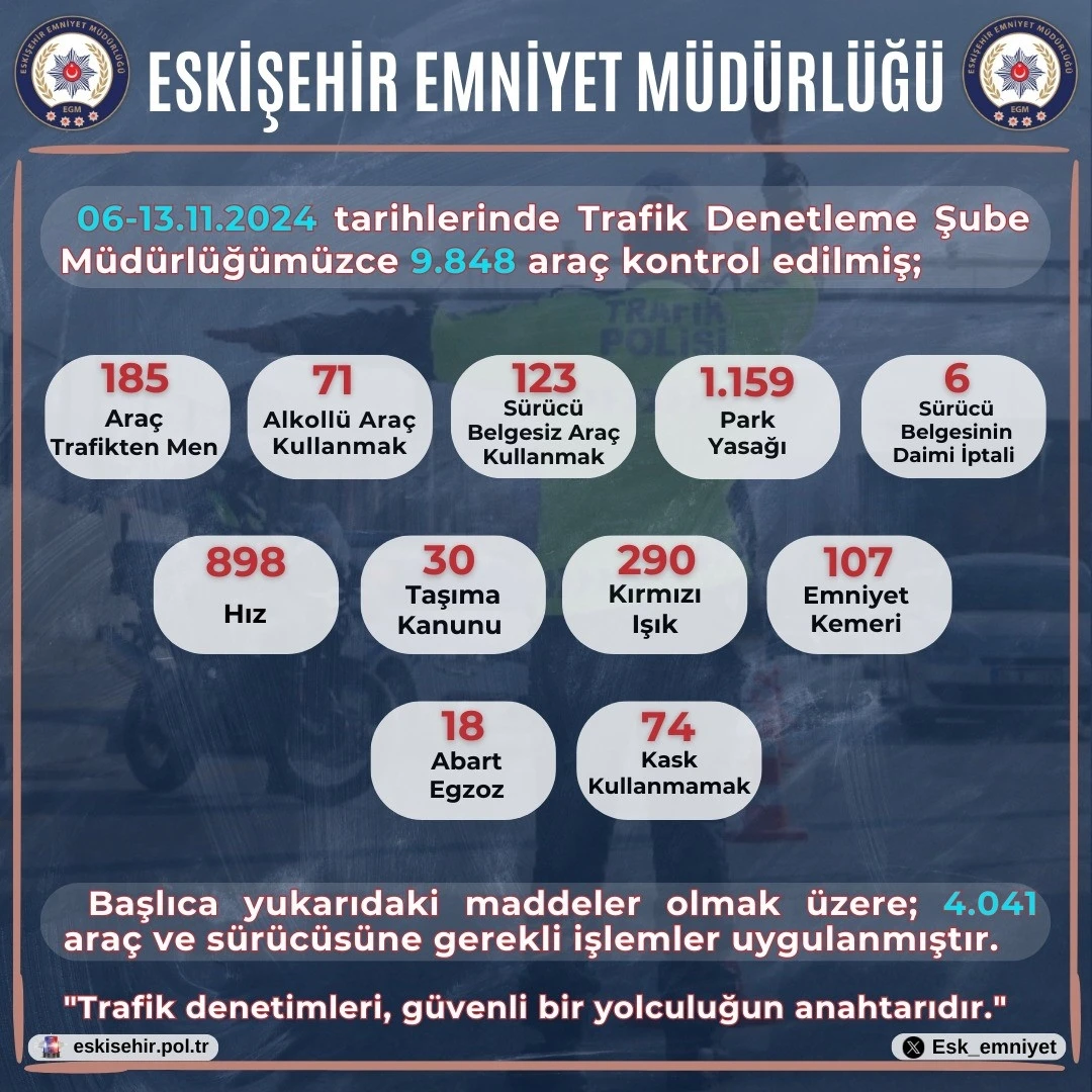 Edinilen bilgilere göre, Eskişehir İl Emniyet Müdürlüğü’ne bağlı ekiplerce trafik denetimi yapıldı. Kentte 6-11 Kasım 2024 tarihleri arasında gerçekleştirilen çalışmalarda, toplam 9 bin 848 araç kontrol edildi. Yapılan kontroller sonucunda alkollü araç kullanmaktan 71, sürücü belgesiz araç kullanmaktan 123, park yasağından bin 159, hızdan 898, taşıma kanunundan 30, kırmızı ışıktan 290, emniyet kemerinden 107, abart egzozdan 18 ve kask kullanmamaktan 74 olmak üzere toplam 4 bin 41 araç ve sürücüye işlem uygulandı. Çalışmalar sonucunda 185 araç trafikten men edilirken, 5 sürücü belgesinin daimi iptalinin yapıldığı öğrenildi.