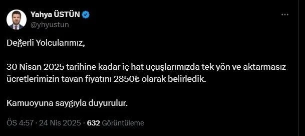 Yeni belirlenen tavan fiyatı Türk Hava Yolları basın müşaviri Yahya Üstün, sosyal medya hesabından duyurdu. Yahya Üstün açıklamasında "Değerli yolcularımız, 30 Nisan 2025 tarihine kadar iç hat uçuşlarımızda tek yön ve aktarmasız ücretlerimizin tavan fiyatını 2 bin 850 lira olarak belirledik. Kamuoyuna saygıyla duyurulur" ifadelerini kullandı.