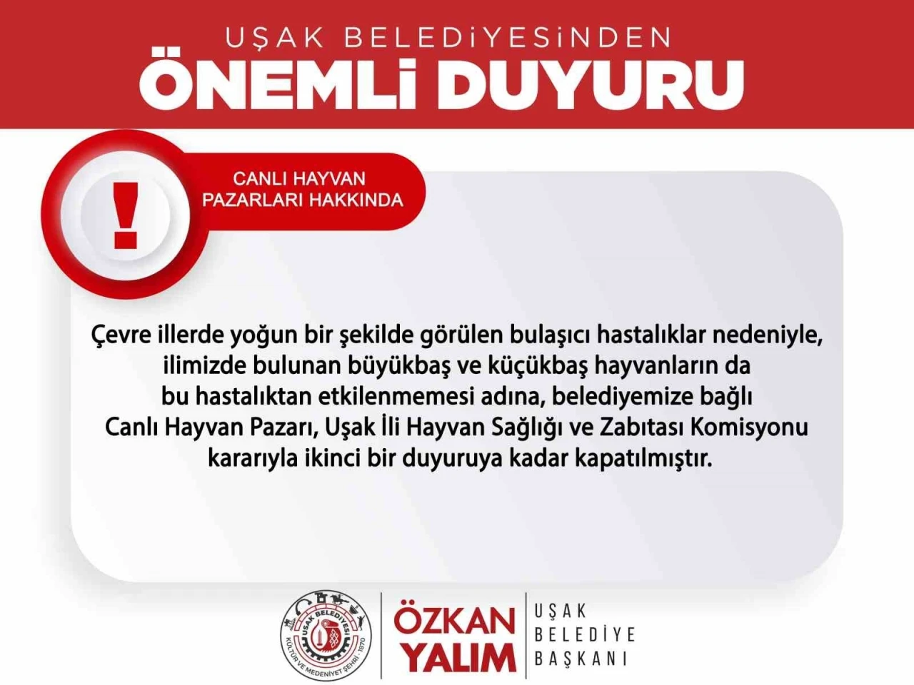 Uşak Belediyesi’nin sosyal medya hesabından yapılan paylaşımda ise; "Çevre illerde yoğun bir şekilde görülen bulaşıcı hastalıklar nedeniyle, ilimizde bulunan büyükbaş ve küçükbaş hayvanların da bu hastalıktan etkilenmemesi adına, belediyemize bağlı Canlı Hayvan Pazarı, Uşak İli Hayvan Sağlığı ve Zabıtası Komisyonu kararıyla ikinci bir duyuruya kadar kapatılmıştır." ifadelerine yer verildi.