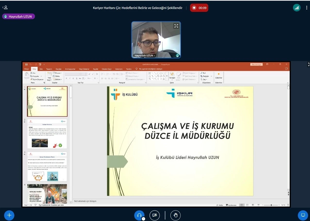 Düzce Üniversitesi Kariyer Geliştirme ve Mezun İzleme Uygulama Araştırma Merkezi tarafından öğrenciler ve mezunların kariyer planlamalarını bilinçli bir şekilde yapmalarını desteklemek amacıyla düzenlenen "Kariyer Haritanı Çiz: Hedeflerini Belirle ve Geleceğini Şekillendir" başlıklı seminer çevrim içi olarak gerçekleştirildi.