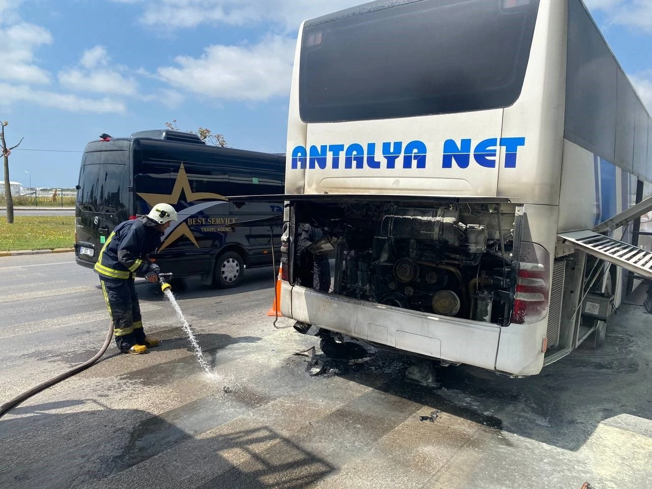 Antalya’da şehirlerarası yolcu otobüsünün motor kısmında çıkan yangın, yedek sürücünün dikkati sayesinde fark edilip büyümeden söndürüldü.