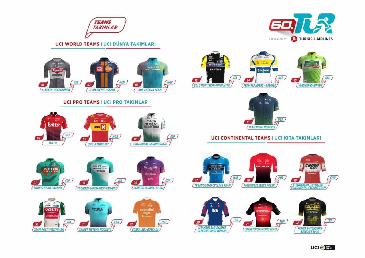 Giro d’Italia, Vuelta a Espana ve Tour de France gibi profesyonel bisikletin en büyük yarışlarına renk katan takımlar da bu kez kozlarını 60. Cumhurbaşkanlığı Türkiye Bisiklet Turu’nda paylaşacak.