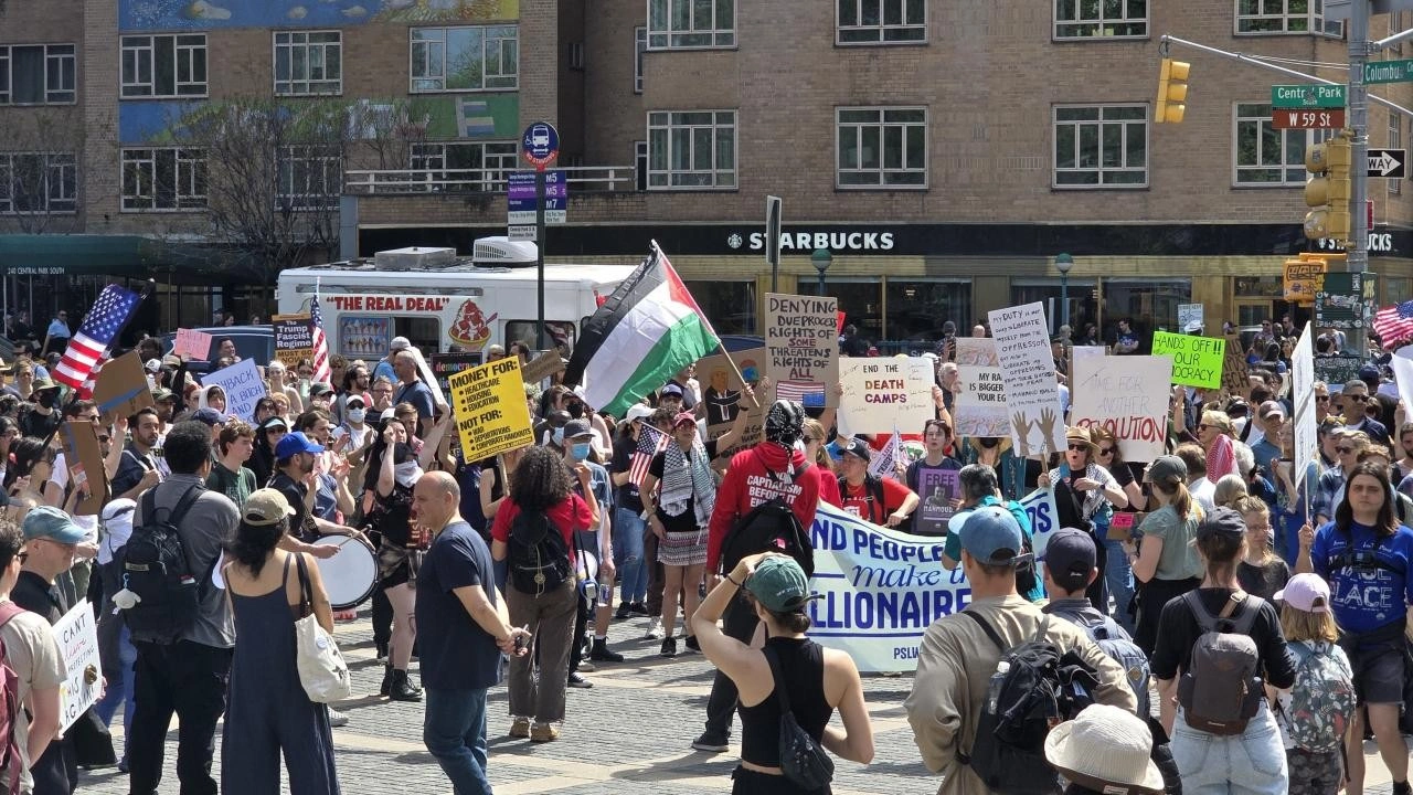 ABD’de Başkan Donald Trump ve yönetimi politikaları nedeniyle tepki görüyor. Trump ve Hükümet Verimliliği Departmanı'nın (DOGE) başındaki Elon Musk’ın göçmen politikalarına, federal çalışanların işten çıkarılmasına ve öğrencilere yönelik baskılarına tepki gösteren binlerce kişi New York şehrinde bir araya geldi. Bryant Park’tan başlayan ve Central Park Columbus Meydanı’nda sona eren protesto gösterisinde "Trump Kral Değil", "Elon Musk İstifa", "Özgür Filistin" gibi sloganlar atan binlerce kişi gözaltına alınan Mahmoud Khalil ve Rümeysa Öztürk için de özgürlük çağrısı yaptı. "Rümeysa’ya Özgürlük", "Mahmoud Khalil’e Özgürlük" yazılı pankartlar taşıyan protestocular, öğrencilerin serbest bırakılmasını istedi.