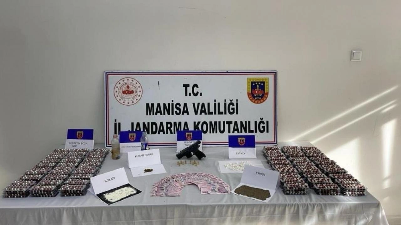 Manisa'nın Akhisar ilçesinde, Akhisar İlçe Jandarma Komutanlığınca M.Y., G.S., R.I., E.E. ve A.İ.'ye ait 3 adres ile şahısların üzerlerinde yapılan aramalarda; 3 bin 851 adet sentetik ecza hapı, 3 adet uyuşturucu kullanma aparatı, 27.25 gram yüksek düzeyli uyuşturucu, 1 adet ruhsatsız av tüfeği, 1 adet ruhsatsız tabanca, 10 adet tabanca mermisi, 6 bin 360 TL suçtan elde edildiği değerlendirilen para ele geçirildi.