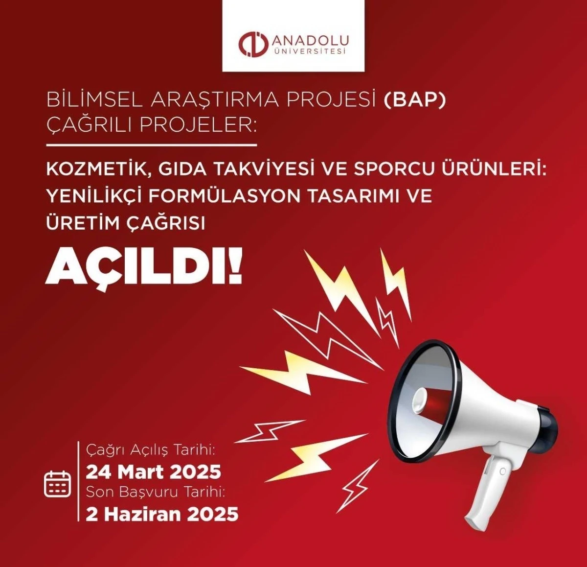 Anadolu Üniversitesi, kozmetik, gıda takviyesi ve sporcu ürünleri alanında yenilikçi formülasyon tasarımı ve üretimine yönelik Bilimsel Araştırma Projeleri (BAP) çağrısını duyurdu.