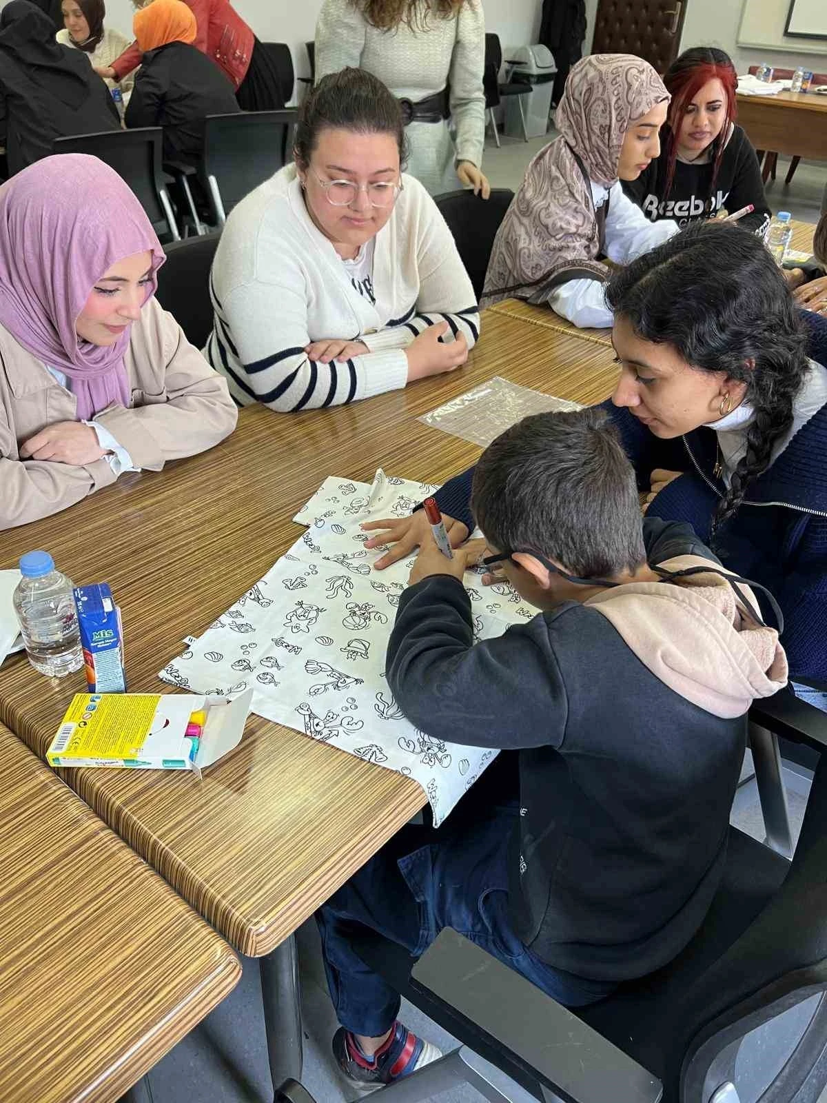 Düzce Meslek Yüksekokulu Konferans Salonu’nda gerçekleştirilen "Minik Eller, Büyük Renkler" adlı etkinlikte, Sevgi Evleri’nde kalan 3-10 yaş grubundaki çocuklar, kendi tişörtlerini özgürce renklendirme fırsatı buldu.