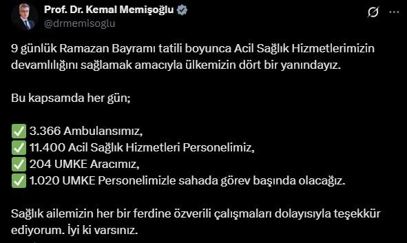 Sağlık Bakanı Kemal Memişoğlu sosyal medya hesabından yaptığı paylaşımda, "9 günlük Ramazan Bayramı tatili boyunca Acil Sağlık Hizmetlerimizin devamlılığını sağlamak amacıyla ülkemizin dört bir yanındayız. Bu kapsamda her gün 3 bin 366 ambulansımız, 11 bin 400 acil sağlık hizmetleri personelimiz, 204 UMKE aracımız, bin 20 UMKE personelimizle sahada görev başında olacağız. Sağlık ailemizin her bir ferdine özverili çalışmaları dolayısıyla teşekkür ediyorum. İyi ki varsınız."