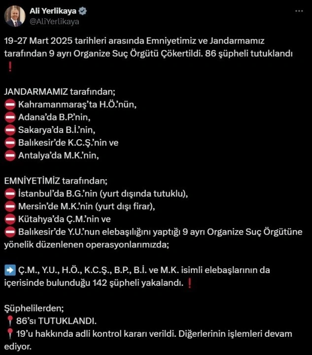 İçişleri Bakanı Ali Yerlikaya, sosyal medya hesabından yaptığı açıklamada, "19-27 Mart 2025 tarihleri arasında emniyetimiz ve jandarmamız tarafından 9 ayrı organize suç örgütü çökertildi, 86 şüpheli tutuklandı. Jandarmamız tarafından; Kahramanmaraş’ta H.Ö.’nün, Adana’da B.P.’nin, Sakarya’da B.İ.’nin, Balıkesir’de K.C.Ş.’nin ve Antalya’da M.K.’nin, emniyetimiz tarafından; İstanbul’da B.G.’nin (yurt dışında tutuklu), Mersin’de M.K.’nin (yurt dışı firar), Kütahya’da Ç.M.’nin ve Balıkesir’de Y.U.’nun elebaşılığını yaptığı 9 ayrı organize suç örgütüne yönelik düzenlenen operasyonlarımızda; Ç.M., Y.U., H.Ö., K.C.Ş., B.P., B.İ. ve M.K. isimli elebaşlarının da içerisinde bulunduğu 142 şüpheli yakalandı. Şüphelilerden 86’sı tutuklandı, 19’u hakkında adli kontrol kararı verildi. Diğerlerinin işlemleri devam ediyor" ifadelerine yer verdi.