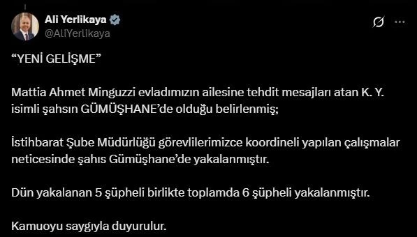 İçişleri Bakanı Ali Yerlikaya, Mattia Ahmet Minguzzi’nin ailesine tehdit mesajları atan K.Y. isimli şahsın İstihbarat Şube Müdürlüğü görevlilerince koordineli yapılan çalışmalar neticesinde Gümüşhane’de yakalandığını sosyal medya hesabından yaptığı paylaşımla duyurdu. Bakan Yerlikaya ‘yeni gelişme’ notuyla yaptığı paylaşımda, "Yakalanan 5 şüpheli ile toplamda 6 şüpheli yakalanmıştır. Kamuoyu saygıyla duyurulur" ifadelerine yer verdi.