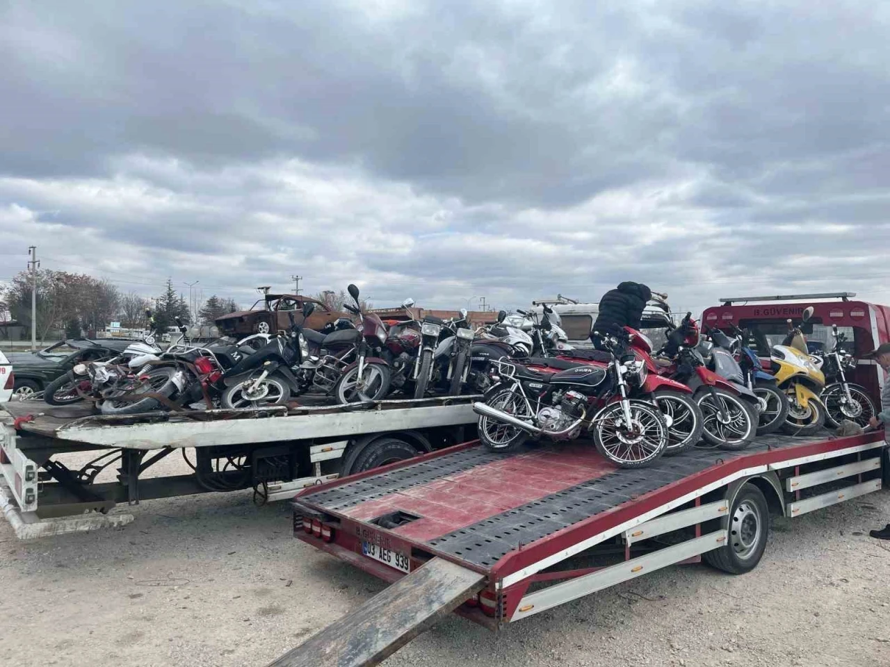 Bolvadin’de İlçe Emniyet Müdürlüğüne bağlı trafik ekipleri çevreye rahatsızlık veren sürücülere yönelik denetimlerini sürdürüyor. Bu çerçevede ekipler ilçedeki park ve bahçelerde çevreye rahatsızlık veren abart egzoz takılı, plakasız, ehliyetsiz, şase numarası olmayan motosikletler trafikten men edildi. Toplanan motosikletlerin sürücülerine ise toplamda 112 bin 328 TL para cezası yazıldı.