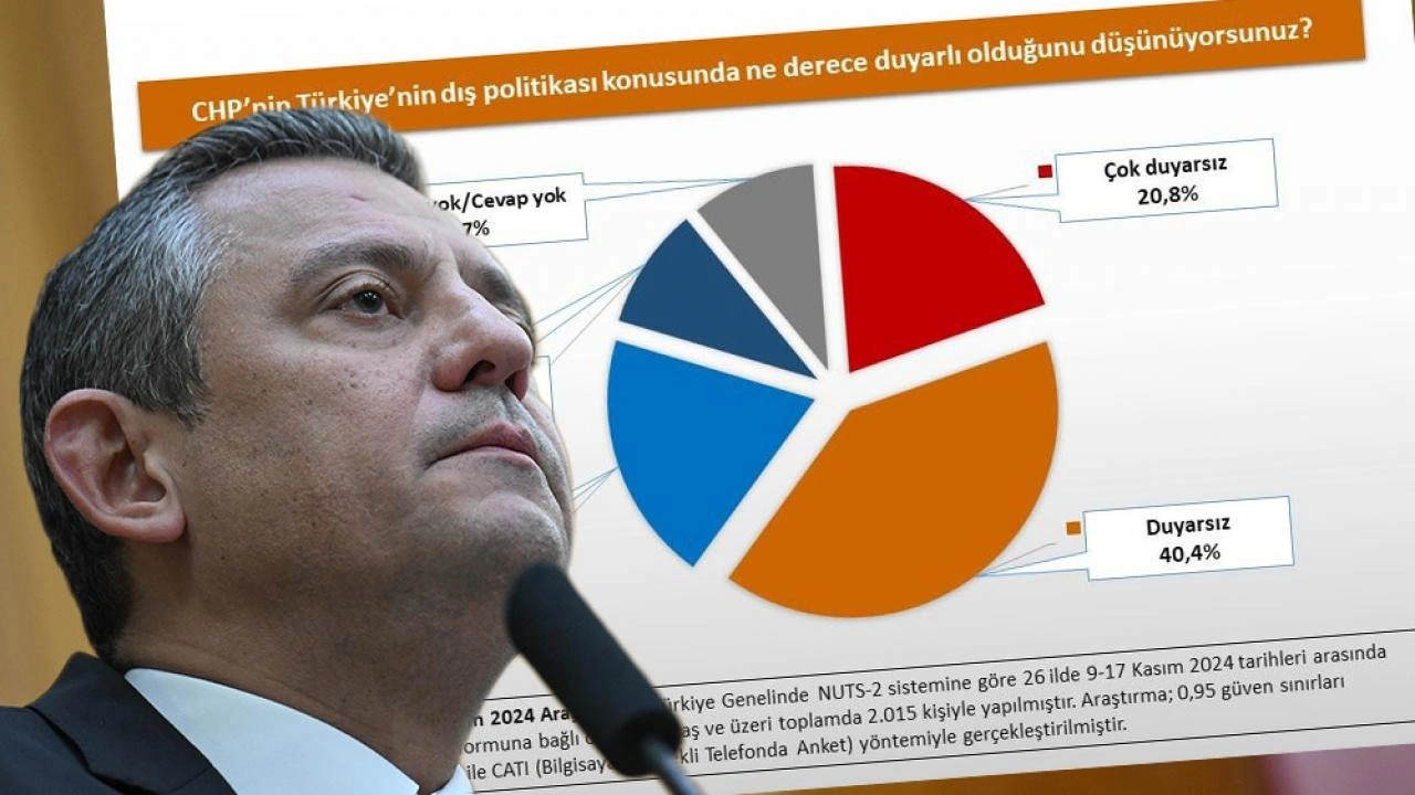 Türkiye Siyasi Gündem Kasım 2024 Araştırması'na göre, CHP'nin Türkiye'nin dış politikası konusundaki duyarlılığı "CHP’nin Türkiye’nin dış politikası konusunda ne derece ilgili/duyarlı olduğunu düşünüyorsunuz?" sorusuyla değerlendirildi. Ankete göre, CHP'nin dış politika konusunda "çok duyarsız" olduğunu düşünenlerin oranı ,8, "duyarsız" olduğunu düşünenlerin oranı %40,4'tür. Yani toplamda katılımcıların %61'i CHP'nin dış politika konusunda kırık not verdi.