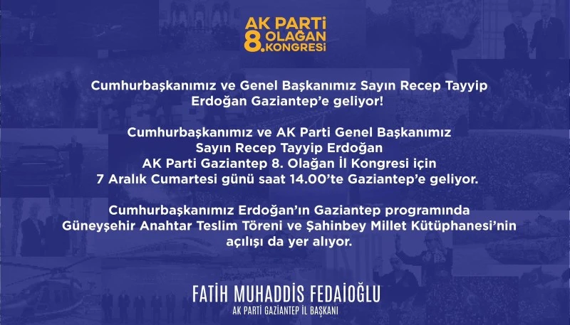Gaziantep’te yapılacak olan il kongresine Cumhurbaşkanı Recep Tayyip Erdoğan’ın katılacağını açıklayan İl Başkanı Fedaioğlu, “İlçe kongrelerimizi tamamlamış bulunuyoruz. Teşkilatımızdaki dinamizm ve heyecan, kongrelerimize de yansıdı. Her bir ilçe kongresinde birlik ve beraberliğimizi daha da pekiştirdik. Şimdi ise önümüzde 8. Olağan İl Kongremiz var. Cumhurbaşkanımız ve Genel Başkanımız Sayın Recep Tayyip Erdoğan, Gaziantep’e gelerek il kongremize bizzat katılacak. Cumhurbaşkanımızı bir kez daha şehrimizde ağırlamak, bizler için büyük bir onur olacak. O bizleri, Gaziantep’i, Gaziantep ise Cumhurbaşkanımızı çok seviyor… Büyük bir heyecan ve özlemle bekliyoruz, hazırız. AK Parti’nin Gaziantep teşkilatı olarak, bu kongreyi en iyi şekilde gerçekleştireceğiz. Bu kongre, sadece partimiz için değil, Gaziantep’imizin siyasi geleceği için de önemli bir dönüm noktası olacak” cümlelerini kullanarak 7 Aralık 2024 Cumartesi günü saat 14:00’da Karataş Şahinbey Kapalı Spor Salonu’na tüm Gazianteplileri davet etti.