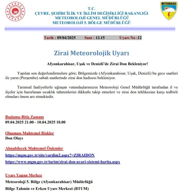 Meteoroloji Genel Müdürlüğü Meteoroloji 5. Bölge Müdürlüğü tarafından yapılan yazılı açıklamada, "Yapılan son değerlendirmelere göre Afyonkarahisar, Uşak ve Denizli’de bu gece saatleri ile yarın sabah saatlerinde zirai don hadisesi bekleniyor. Tarımsal faaliyetlerle uğraşan vatandaşlarımızın Meteoroloji Genel Müdürlüğü tarafından il ve ilçeler için hazırlanan sıcaklık tahminlerini dikkatle takip etmeleri ve zirai don tehlikesine karşı tedbirli olmaları önem arz etmektedir" ifadeleri yer aldı.