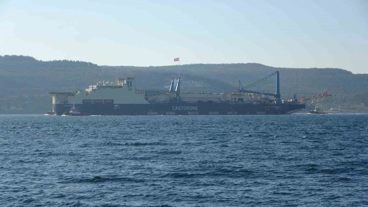 Türkiye’nin Karadeniz’de keşfettiği doğalgazı karaya ulaştıracak boruları döşeyen derin denizde boru döşeme gemisi ’Castorone’ Çanakkale Boğazı’ndan geçti.