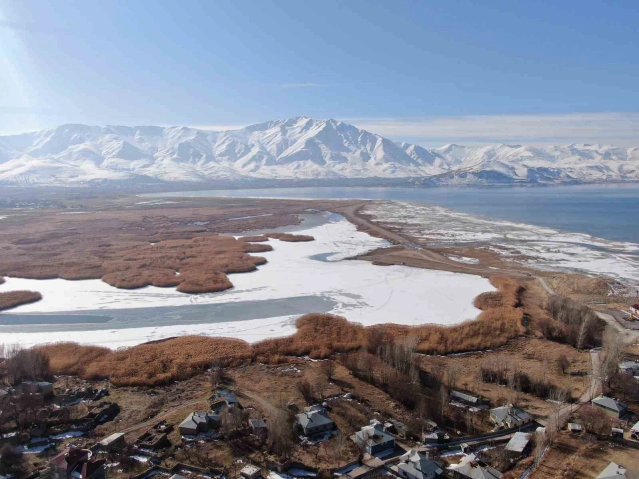 Van’ın Edremit ilçesinde onlarca türden kuşun barındığı ve yüzeyi buzla kaplanan Dilkaya Sazlığı kartpostallık görüntülere sahne oluyor.