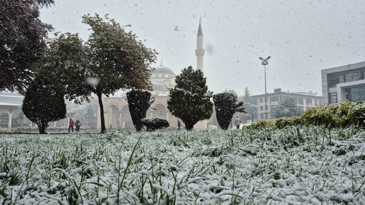 DÜZCE (İHA) – Düzce’de etkili olan kar yağışıyla birlikte kent merkezi beyaza büründü.