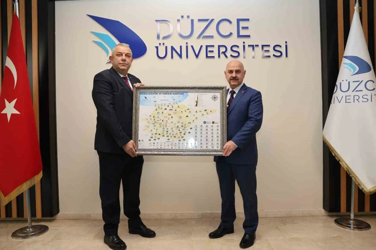 Düzce Ticaret ve Sanayi Odası(DTSO) Yönetim Kurulu Başkanı Erdoğan Bıyık, Genel Sekreter Yardımcısı Engin Çavuş ve Turizm Ar-Ge Koordinatörü Ömer Özcan, Düzce Üniversitesi Rektörü Prof. Dr. Nedim Sözbir’i makamında ziyaret etti. Düzce’nin sahip olduğu turizm potansiyeli, bölgenin ekonomik ve kültürel kalkınmasına yönelik projeler ve iş birlikleri üzerine fikir alışverişinde bulunuldu. Düzce Ticaret ve Sanayi Odası heyeti, ilin turizm değerlerini tanıtmak amacıyla hazırlanan Düzce Kültür ve Turizm Haritasını, Rektör Prof. Dr. Nedim Sözbir’e takdim etti.