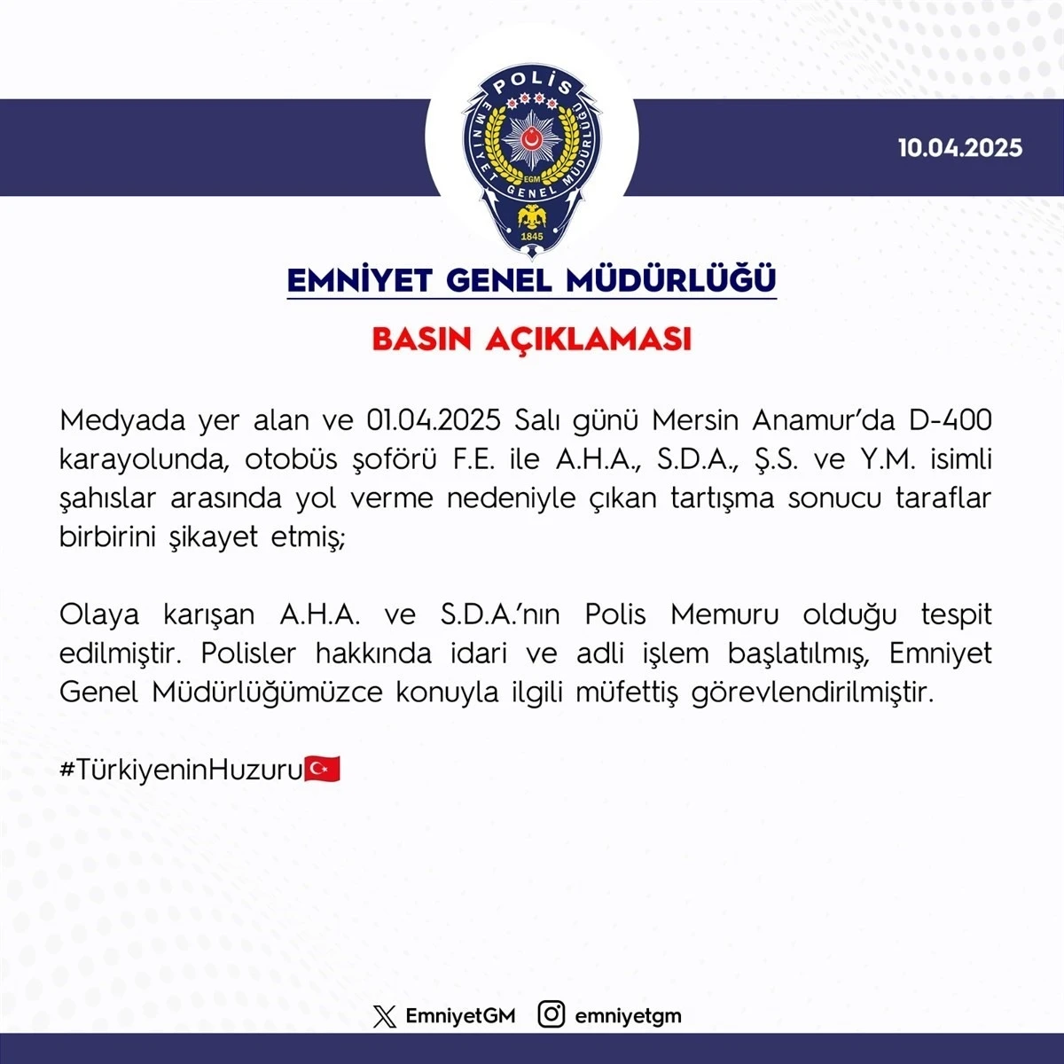 Konuyla ilgili EGM’den yapılan açıklamada, "Medyada yer alan ve 01.04.2025 Salı günü Mersin Anamur’da D-400 karayolunda, otobüs şoförü F.E. ile A.H.A., S.D.A., Ş.S. ve Y.M. isimli şahıslar arasında yol verme nedeniyle çıkan tartışma sonucu taraflar birbirini şikayet etmiş; Olaya karışan A.H.A. ve S.D.A.’nın Polis Memuru olduğu tespit edilmiştir. Polisler hakkında idari ve adli işlem başlatılmış, Emniyet Genel Müdürlüğümüzce konuyla ilgili müfettiş görevlendirilmiştir" ifadeleri yer aldı.