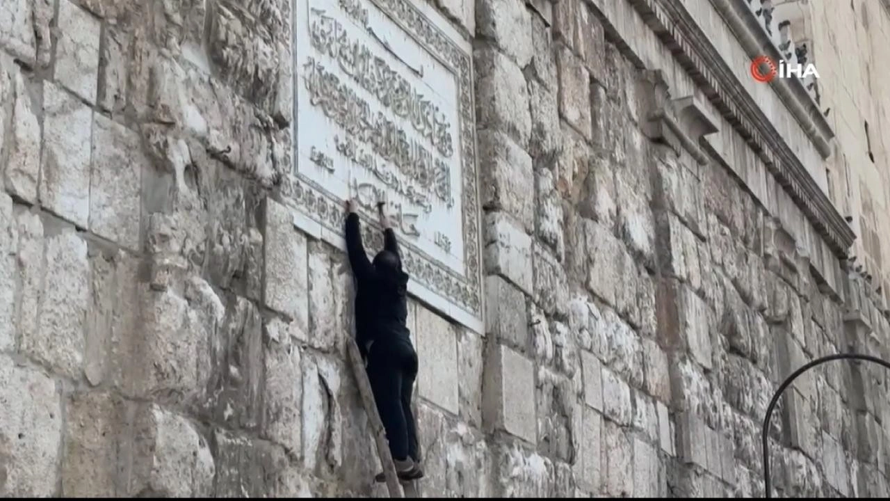 Suriye'de Esed rejiminin izleri silinmeye devam ediyor. Başkent Şam'ın sembolü olan tarihi Emevi Camii'nin duvarındaki mermer kitabede bulunan eski Suriye Devlet Başkanı Hafız Esed'in adı, cuma namazını kılmak üzere camiye gelenler tarafından silindi.