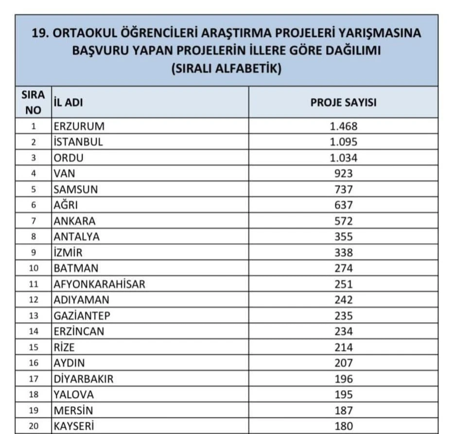 TÜBİTAK tarafından yapılan açıklama göre TÜBİTAK 2204-B 19. Ortaokul Öğrencileri Araştırma Projeleri Yarışması’na Türkiye genelinde 13 bin 918 başvuru yapıldı. Erzurum, bin 468 başvuru ile "Türkiye Birincisi" olurken; Erzurum’u sırasıyla bin 95 başvuruyla İstanbul, bin 34 başvuruyla Ordu, 923 başvuruyla Van ve 737 başvuruyla Samsun izledi.