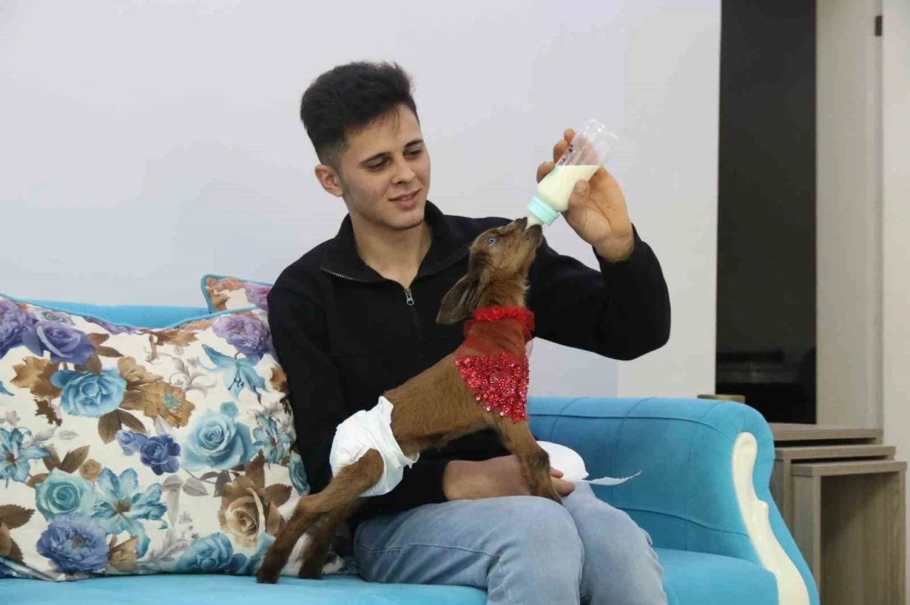Eskişehir’de evine aldığı keçi yavrusuna bebek gibi bakan Muharrem Altınbaş, yavruyu biberonla besliyor.
