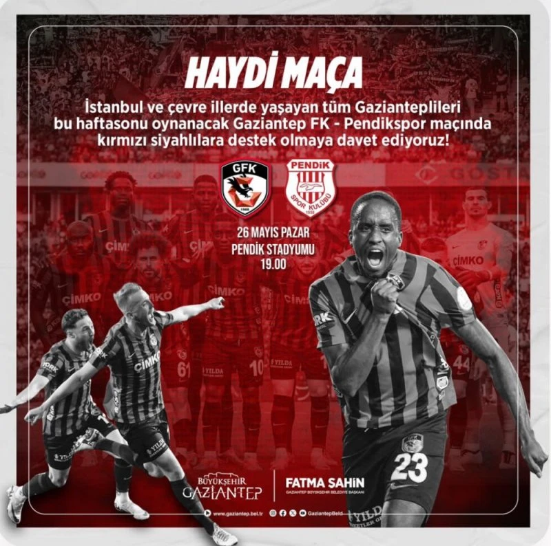 Gaziantep Büyükşehir Belediye başkanı Fatma Şahin, sosyal medya hesaplarından İstanbul ve çevre illerde yaşayan tüm Gazianteplilere seslenerek pazar günü oynanacak olan Pendikspor-Gaziantep Futbol Kulübü karşılaşmasında destek istedi. Geçtiğimiz hafta Fatih Karagümrük maçından önce tesislere giderek yönetim, teknik direktör, ve futbolculara moral ve destek veren Fatma Şahin , pazar günü oynanacak olan final maçı öncesinde İstanbul’da ve çevre illerde yaşayan tüm Gazianteplileri Pendikspor karşılaşmasına davet etti.