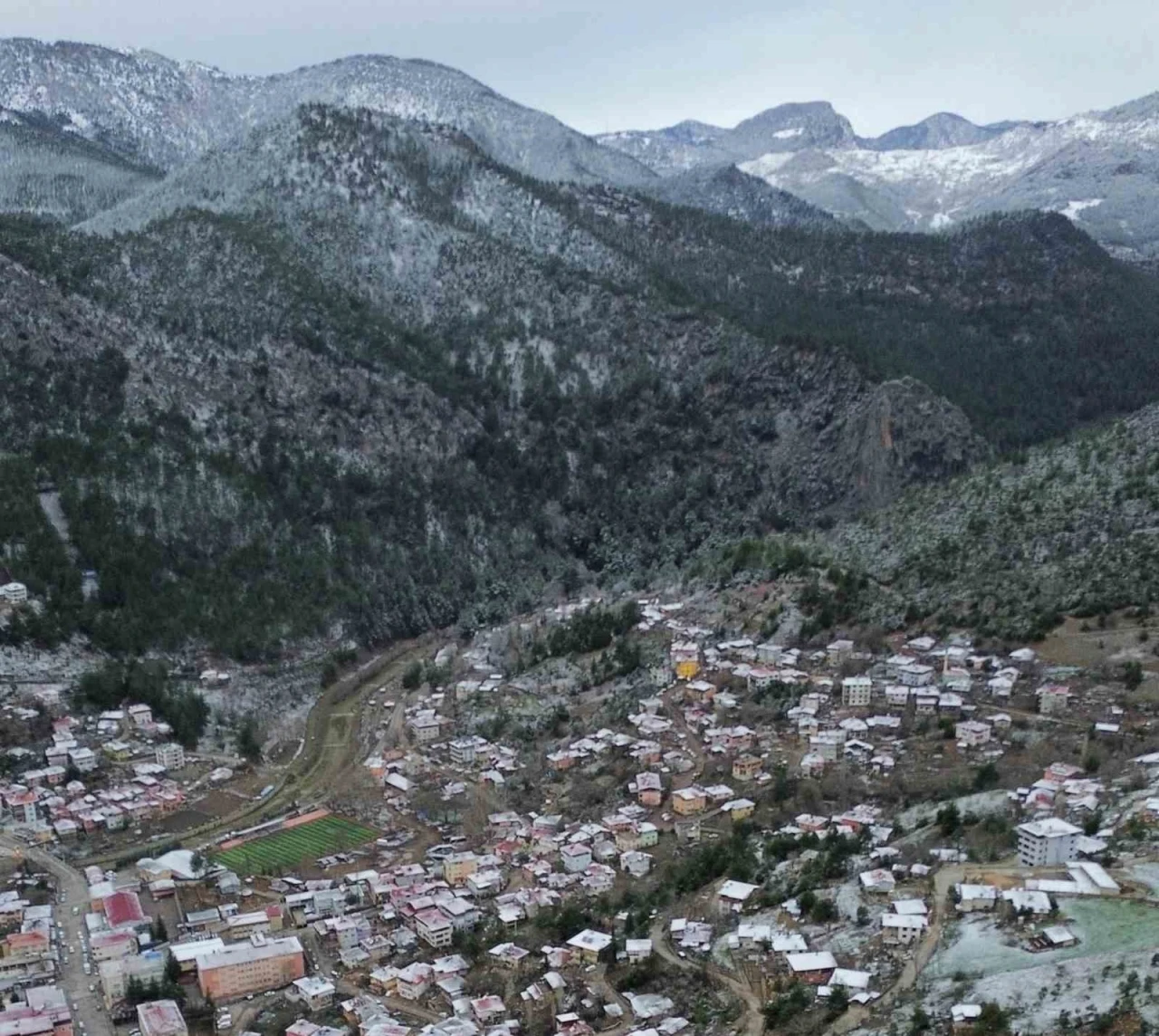 Adana’nın Feke ilçesinde kar yağışı görsel şölen sunarken bölge havadan görüntülendi.